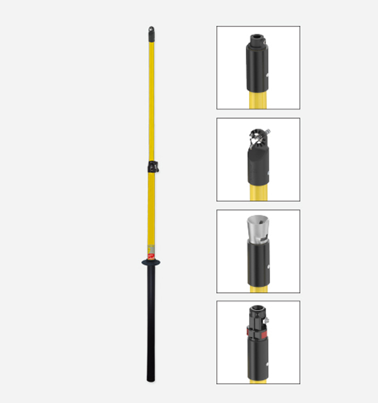 Telescopic pole with two sections made of reinforced fibreglass tube Ø 37 and 30 mm with humidity-proof seals on each end, hand protector, grip, tip and M (Metric-10), U (Universal), B (Bayonet) or P (Hexagonal + Metric-10) head.