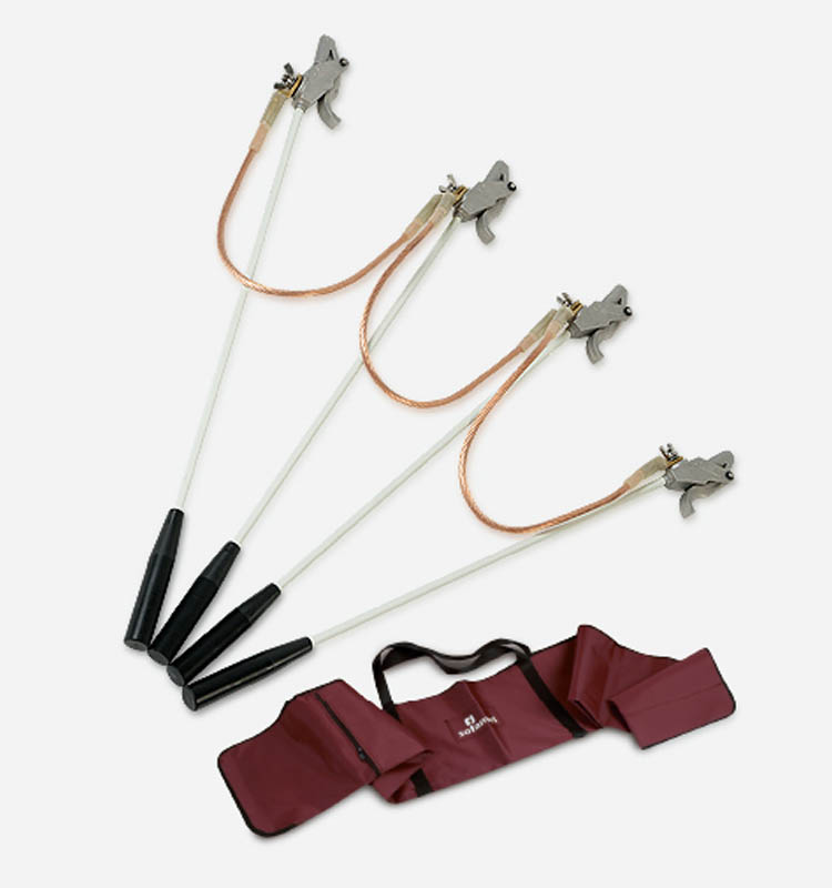 - 4 PEBT spring clamps with 70 cm poles for cylindrical conductors with diameter between 3 and 18 mm.