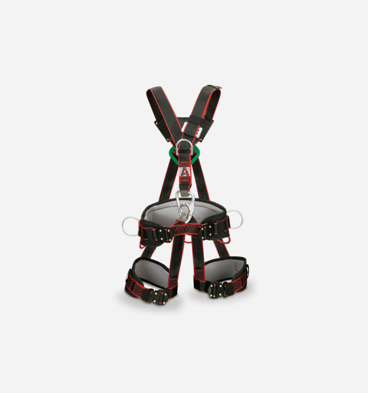 Full body safety harness designed for use in all work environments involving heights equipped with foam back support and fast positioning buckles on the leg straps with four equipment loops. Includes four attachment points: Chest attachment point Stomach attachment point, for suspension or positioning Back attachment point Two adjustable lateral positioning rings According to EN 361 and EN 358 standards